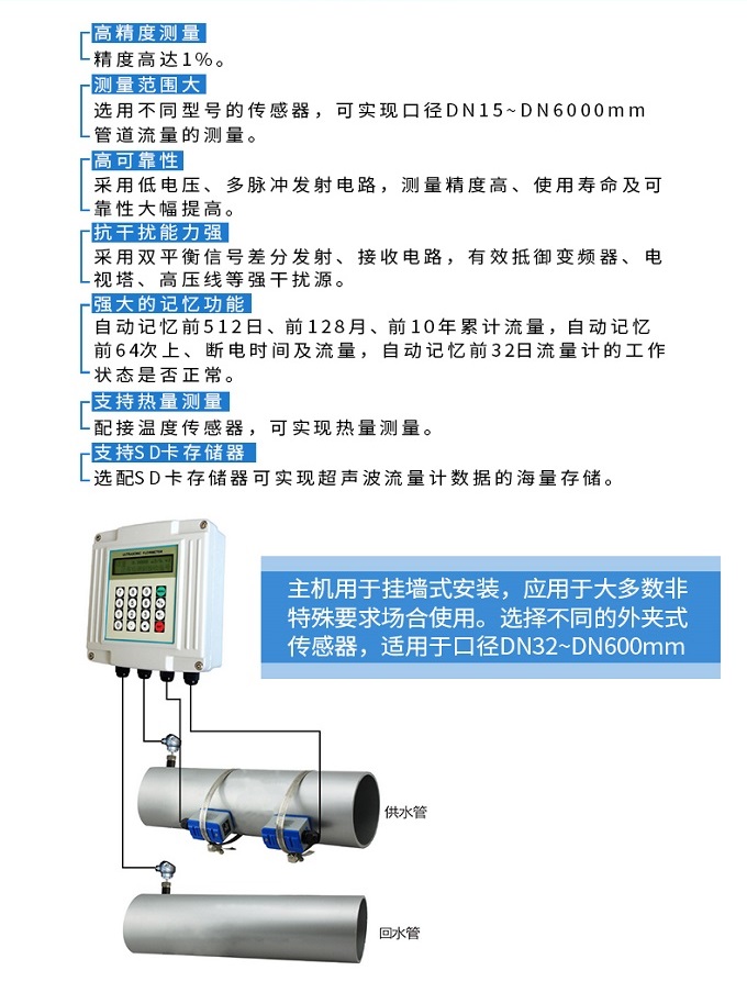 外夾壁掛式超聲波流量計利用了低電壓,多脈沖時差原理,采用高精度和超穩定的雙平衡信號差分發射、差分接收數字檢測技術來測量順流和逆流方向的聲波傳輸時間,根據時差計算出流速。具有穩定性好、零點漂移小、測量精度高,量程比寬抗干擾性強等特點。